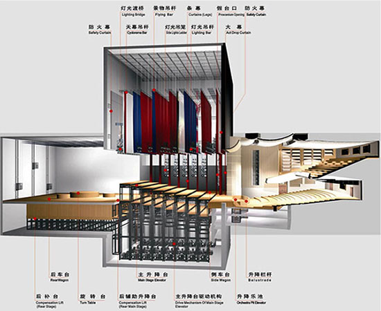 舞臺機械是為了保證最佳演出效果而采用的機械裝置。舞臺機械分為上部機械與舞臺下部機械。舞臺上部機械包括:音響反射板、防火幕、臺口幕、布幕吊桿、燈光吊桿、燈光吊籠、柱光架、舞臺口、吊點機、大幕拉幕機、電影寬銀幕等;下部機械包括:升降樂池、升降臺、滑臺、車臺、轉(zhuǎn)臺等。 舞臺機械系統(tǒng)是比較復(fù)雜、特殊的演藝機械設(shè)備。系統(tǒng)的可行性、可靠性和安全性是設(shè)計和施工過程中最重要環(huán)節(jié)。舞臺機械作為一種非常專業(yè)的領(lǐng)域,非常講究工藝設(shè)計和技術(shù)要求,以確保設(shè)備功能的完美和使用的安全、可靠。建筑設(shè)計必須為舞臺設(shè)計提供足夠的空間尺度,滿足臺上機械布置。同時,在設(shè)計時應(yīng)考慮舞臺機械設(shè)備荷載、預(yù)埋件、用電負荷等要求。舞臺機械設(shè)計不僅要滿足舞美及舞臺其它設(shè)備的布置要求,而且還要滿足所有舞臺設(shè)備的安裝、檢修、操作等使用要求。舞臺機械系統(tǒng)在工藝設(shè)計、設(shè)備制造、安裝過程中嚴格按照行業(yè)設(shè)計規(guī)范,可靠性標(biāo)淮,系統(tǒng)部分關(guān)鍵部位甚至高于標(biāo)準要求,使設(shè)備有長期穩(wěn)定的工作能力,確保全套系統(tǒng)安全、可靠。